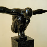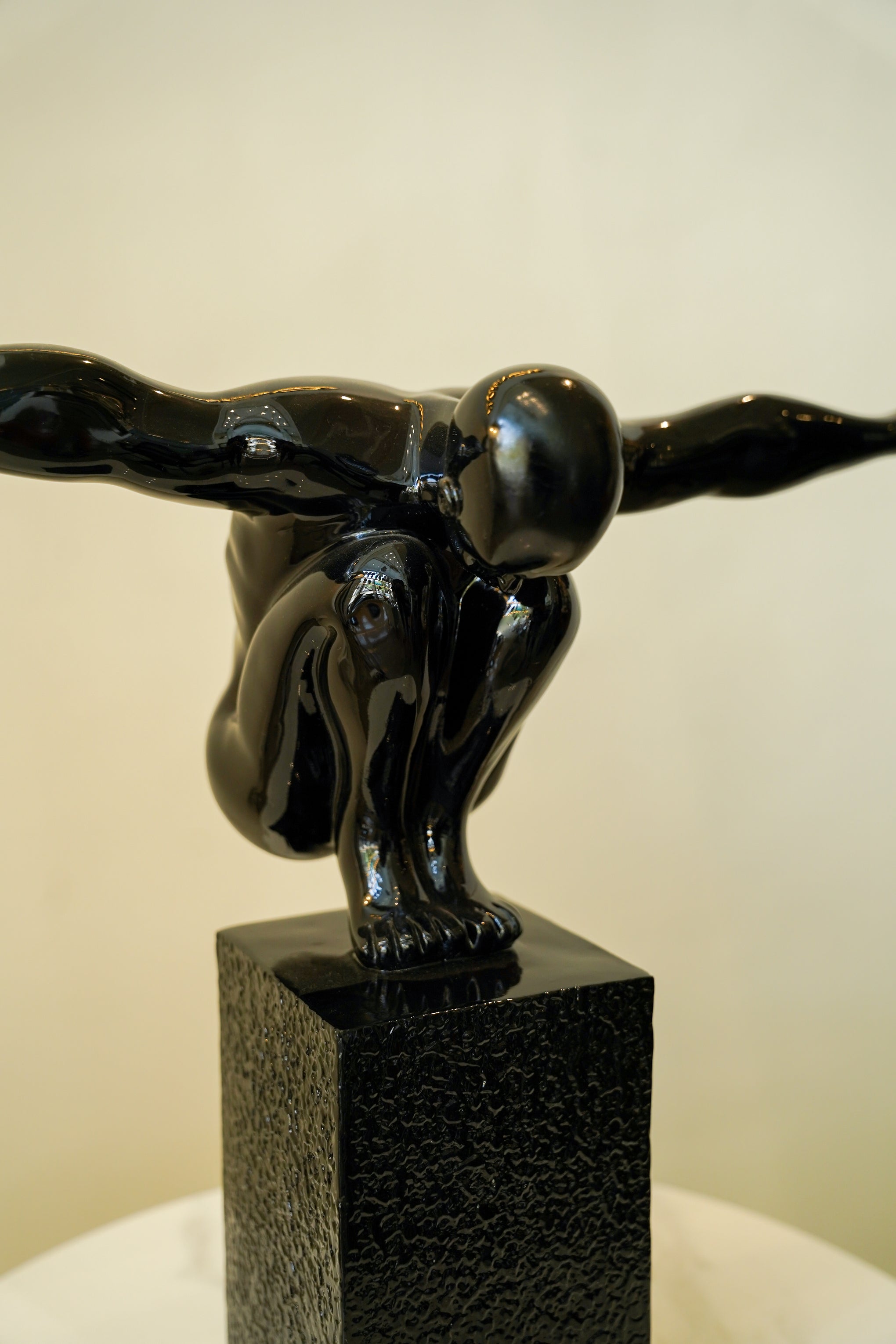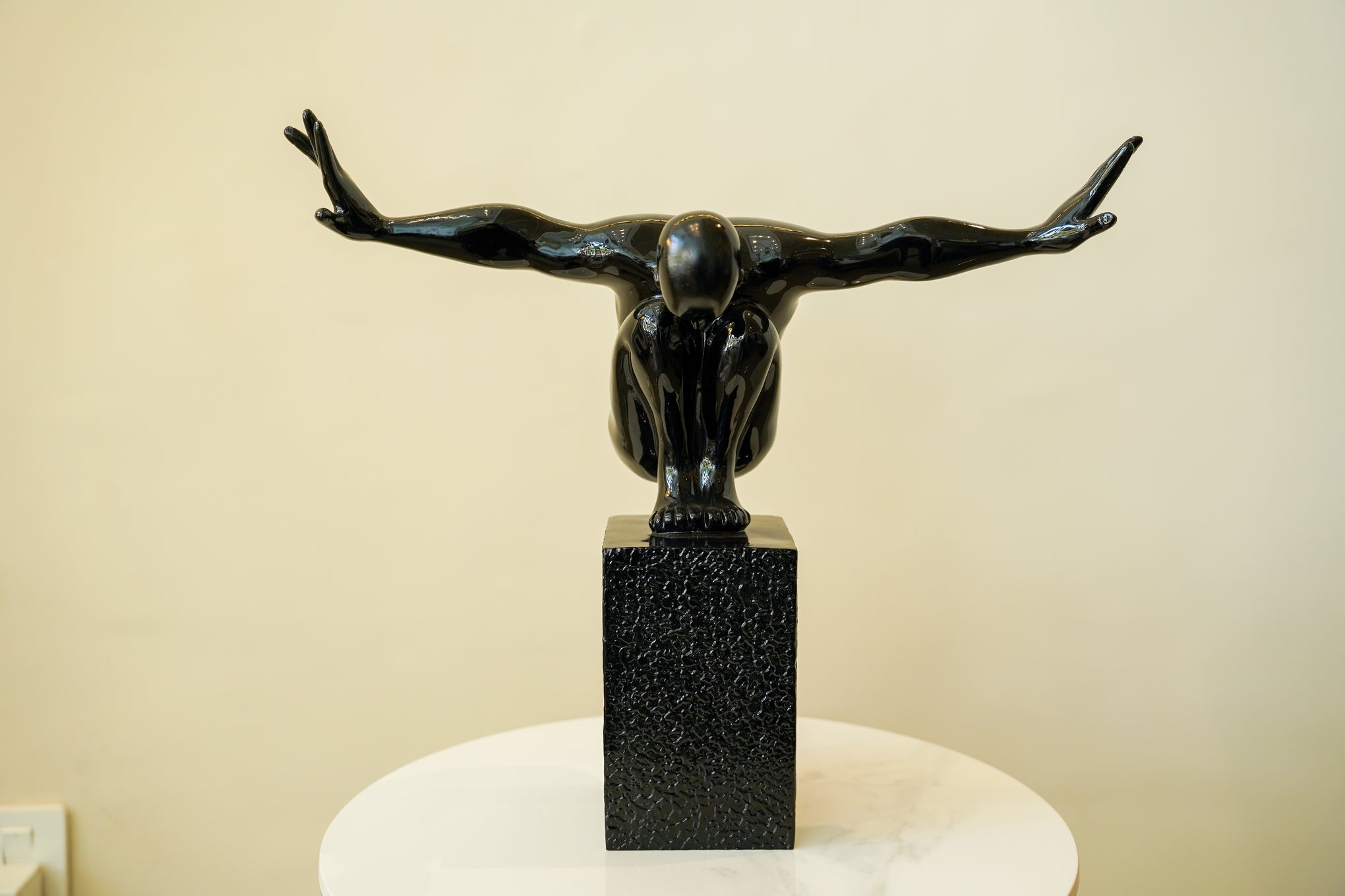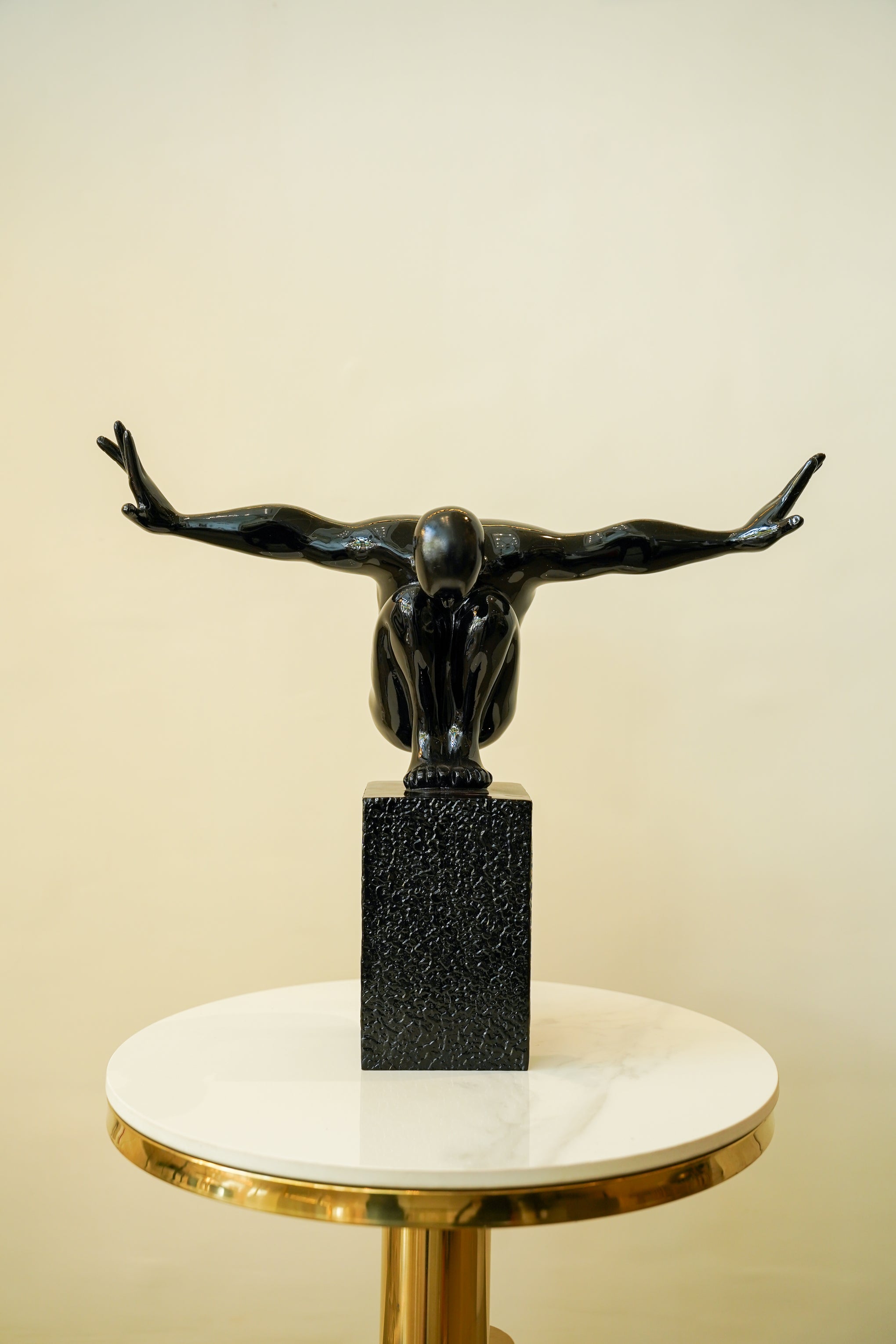 A striking representation of stillness and reflection, this abstract black statue captures a quiet moment suspended in time. Its minimalist form and deep matte finish make it a powerful accent for modern interiors, workspaces, or contemplative corners.