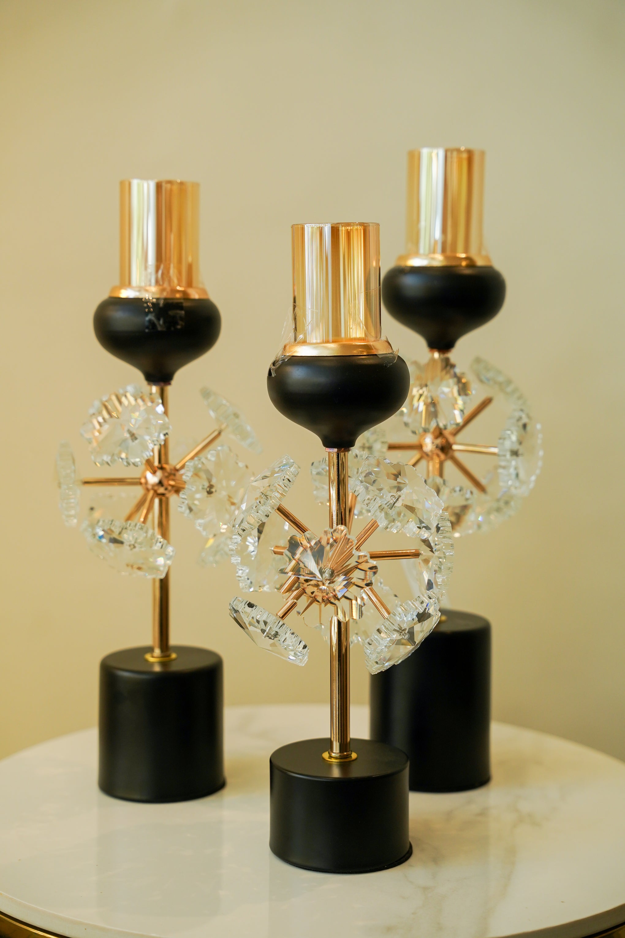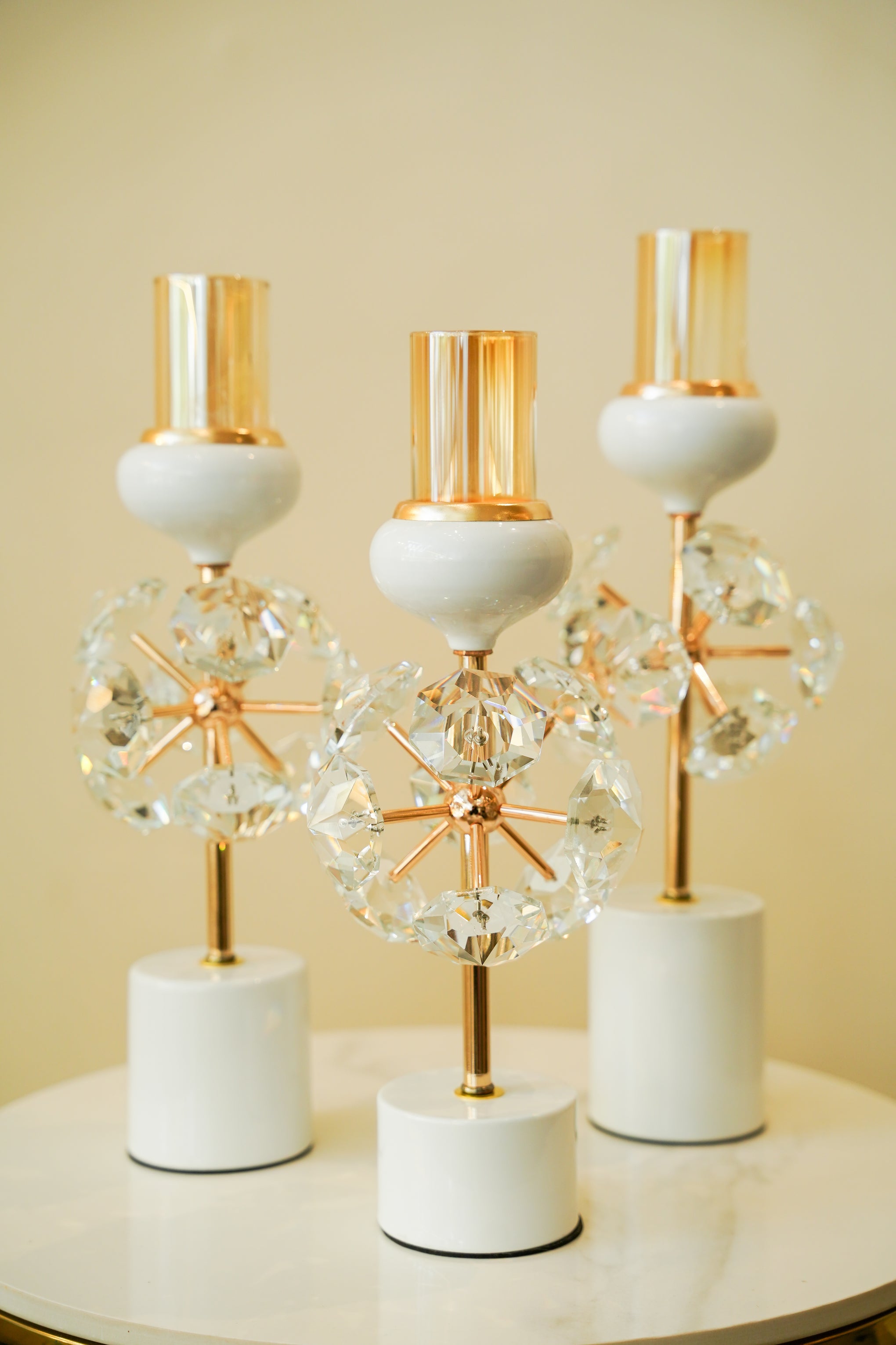 Bring brilliance to your space with this 3-piece crystal candle stand set. Featuring finely cut crystal bases that reflect light beautifully, these stands create a glowing ambiance for formal dinners, weddings, or luxurious home decor.